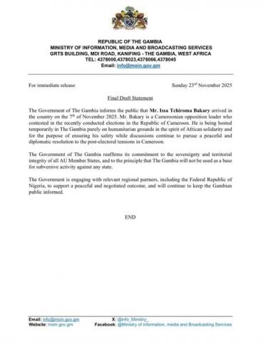 أعلنت الحكومة الغامبية أن المعارض الكاميروني عيسى تشيروما وصل إلى أراضيها في 7 نوفمبر الجاري، مؤك