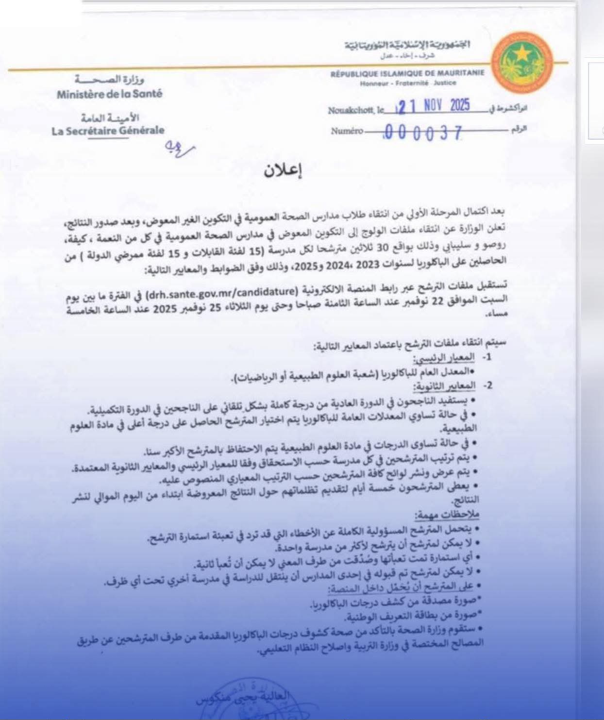 أعلنت وزارة الصحة،يوم أمس الجمعة، عن فتح باب إيداع ملفات الترشح للتكوين المُعَوَّض في مدارس الصحة العموميةفي كل من النعمة، كيفه، روصو، وسيليبابي، وذلك بعد اكتمال المرحلة الأولى من الانتقاء وفرز النتائج الأولية للمترشحين.