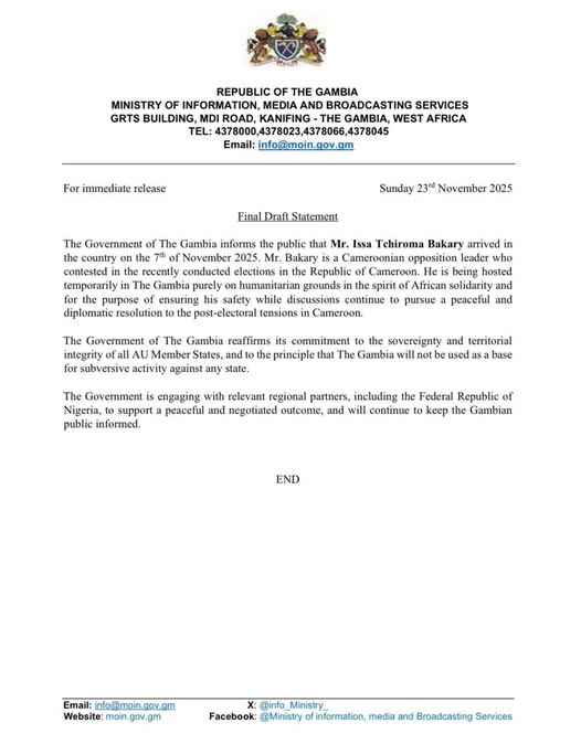 أعلنت الحكومة الغامبية أن المعارض الكاميروني عيسى تشيروما وصل إلى أراضيها في 7 نوفمبر الجاري، مؤكدة أنها تستضيفه مؤقتًا لأسباب إنسانية، وفي إطار ما وصفته بـ"روح التضامن الإفريقي"، حرصًا على ضمان سلامته وسط التوترات التي أعقبت الانتخابات في الكاميرون.
