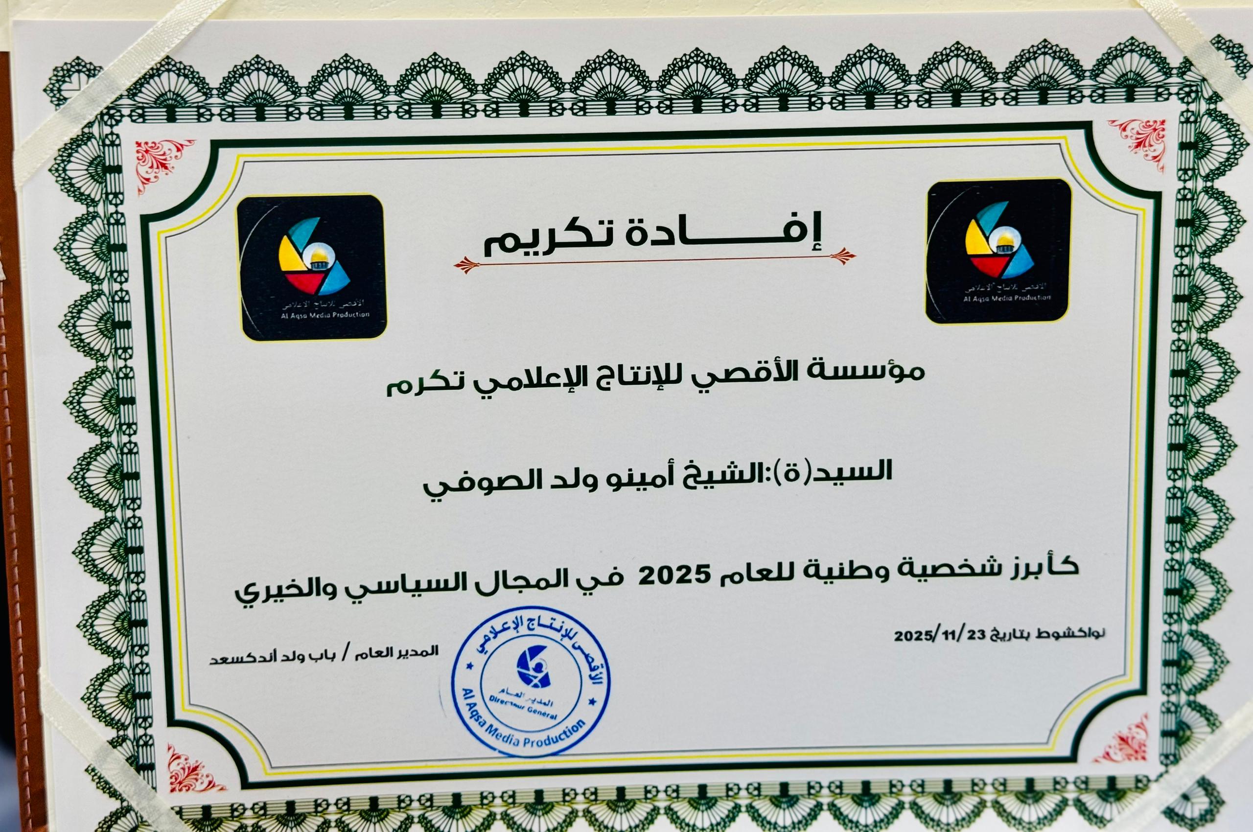 كرّمت مؤسسة الأقصى للإنتاج الإعلامي فضيلةَ الشيخ : الشيخ أمين الصوفي، رئيس جمعية طيبة للثقافة، كأبرز شخصية وطنية للعام 2025 في المجال السياسي والخيري، تقديرًا لمسيرته المتواصلة في خدمة المجتمع، وإسهاماته الكبيرة في العمل الخيري بمختلف مجالاته.